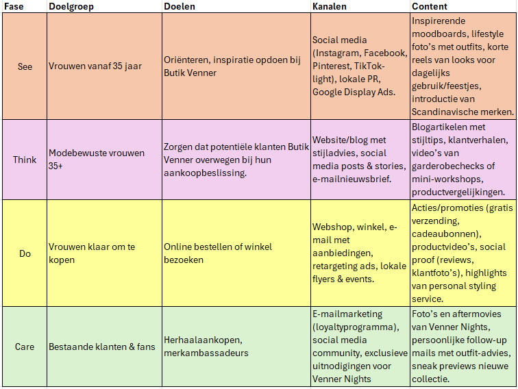 2. Corporate film bouwt merkgevoel en vertrouwen (winkel, team, service), ideaal voor See/Think. Product/demo video’s helpen twijfels weg te nemen in Think/Do: pasvorm, combinaties, levertijd. Korte uitleg/awareness video’s (animatie of mixed) scoren op See/Think op social: snel, snackable, makkelijk deelbaar.