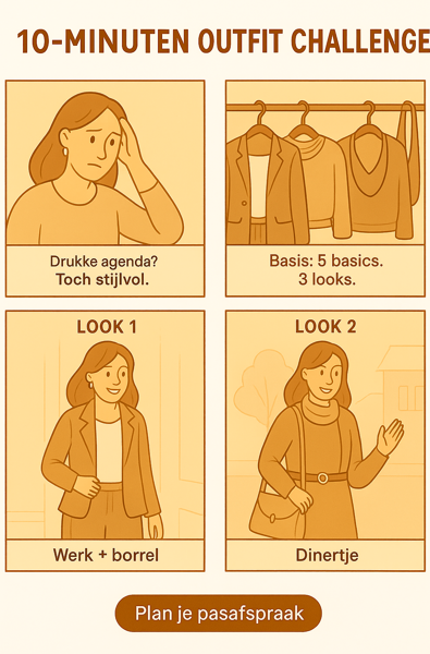 Leg ’s avonds je set klaar, inclusief sieraden en panty. Hang je blazer al over de stoel, zet schoenen bij de deur. Kost twee minuten en scheelt ochtendstress. Tip: maak een foto van combinaties die je mooi vindt; zo heb je altijd inspiratie bij de hand.