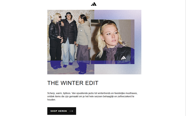 Adidas laat met deze e-mail opnieuw zien hoe sterk hun merkverhaal is. De campagne draait om The Winter Edit een stijlvolle collectie die warmte en zelfvertrouwen uitstraalt. De tekst is kort maar krachtig: scherp, warm en tijdloos. Het draait niet alleen om kleding, maar om een gevoel. Je ziet meteen dat Adidas zich richt op een jonge, modebewuste doelgroep die waarde hecht aan comfort én uitstraling. De e-mail is strak vormgegeven en duidelijk. De foto’s zijn van hoge kwaliteit, met zachte kleuren en een moderne lay-out. Alles klopt, de stijl, de rust, de typografie. Zelfs de ‘Shop Heren’ knop is subtiel maar opvallend. Het is typisch Adidas minimalistisch, sportief en professioneel. Qua volwassenheid binnen het E-mail Marketing Maturity Model bevindt Adidas zich in fase 3 richting 4. Hun e-mails zijn volledig in lijn met hun merkidentiteit, datagedreven en waarschijnlijk onderdeel van een grotere, geautomatiseerde campagne. Gepersonaliseerde productaanbevelingen of seizoensgebonden flows die automatisch worden geactiveerd. Wat Adidas erg goed doet, is de sterke visuele identiteit en de duidelijke boodschap. Alles voelt doordacht en op elkaar afgestemd. Een klein verbeterpunt zou zijn om meer persoonlijke elementen toe te voegen, bijvoorbeeld een aanhef met de naam van de ontvanger of suggesties gebaseerd op eerdere aankopen. Dat zou hun e-mails nog relevanter en persoonlijker maken.