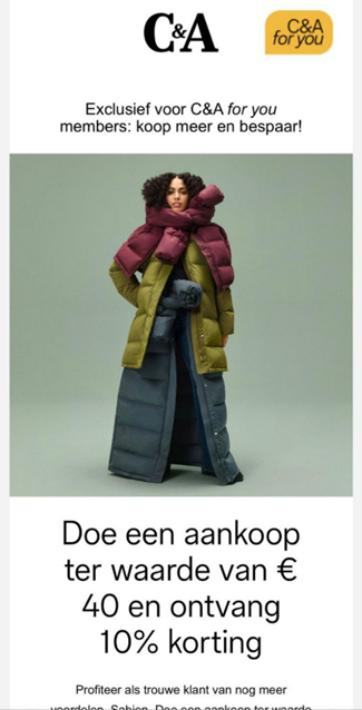 C&A weet hun klanten op een slimme manier aan te spreken met deze campagne-e-mail. De boodschap is helder en gericht op actie. Bij een aankoop van €40 krijg je 10% korting. Daarmee willen ze klanten stimuleren om iets extra’s te kopen, terwijl ze tegelijkertijd hun “C&A for you” leden belonen. Het is een mooie manier om loyaliteit te versterken en klanten zich speciaal te laten voelen. De mail zelf is overzichtelijk. Een grote, opvallende productfoto trekt meteen de aandacht en de tekst is kort en duidelijk. De verschillende lettergroottes en kleuren zorgen ervoor dat de belangrijkste boodschap eruit springt. Alles past goed binnen de vertrouwde C&A-stijl en de e-mail leest prettig, zowel op de telefoon als op de computer. Als we kijken naar het E-mail Marketing Maturity Model, zit C&A waarschijnlijk in fase 2 of het begin van fase 3. Ze gebruiken e-mail niet alleen om te informeren, maar ook om klanten te segmenteren en te belonen met exclusieve kortingen. Toch is er nog ruimte om verder te groeien, bijvoorbeeld door meer dynamische of persoonlijke foto’s toe te voegen. Wat C&A al goed doet, is de duidelijke en commerciële boodschap in combinatie met een sterke visuele presentatie. De lezer weet direct wat de actie is en wat de voordelen zijn. Als ze in de toekomst meer personalisatie toevoegen, denk aan aanbevelingen op basis van eerdere aankopen of een persoonlijke aanhef. Dan kunnen hun e-mails nog iets meer persoonlijker worden wat meer conversie gaat geven.