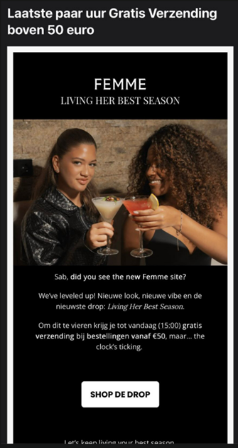 FEMME weet precies hoe ze hun publiek moeten aanspreken. De boodschap is duidelijk: nog maar een paar uur gratis verzending bij bestellingen boven de €50. De toon is speels en direct, met zinnen als “the clock’s ticking” die meteen een gevoel van haast oproepen. Het voelt alsof je een berichtje krijgt van een vriendin die zegt: “Kom op, nu even snel bestellen!” De e-mail zelf ziet er strak en modern uit. De foto’s van twee vrouwen met kleurrijke cocktails trekken meteen de aandacht en passen perfect bij de chique, zelfverzekerde stijl van het merk. De opmaak is professioneel, met duidelijke knoppen en korte, krachtige teksten. Qua volwassenheid op het gebied van e-mailmarketing zit FEMME ergens in fase 2 of het begin van fase 3 van het maturity model. Ze gebruiken al personalisatie – de klant wordt bij naam aangesproken – en ze bouwen spanning op met tijdelijke acties. Toch is er nog ruimte om verder te groeien door e-mails dynamischer te maken, bijvoorbeeld met productaanbevelingen op basis van eerdere aankopen. Wat ze al goed doen, is de persoonlijke toon en het gevoel van urgentie. Het voelt niet als een standaard reclame, maar als een uitnodiging. Als ze in de toekomst nog meer gebruikmaken van data om hun mails af te stemmen op de interesses van de klant, kunnen ze hun campagnes naar een nog hoger niveau tillen.