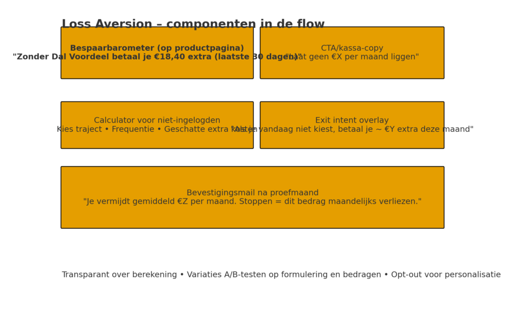 3. Op de productpagina toon ik een persoonlijke bespaarbarometer: op basis van recente reizen laat ik zien hoeveel iemand extra betaalt zonder Dal Voordeel. Voor niet-ingelogde bezoekers staat er een korte calculator met voorbeeldscenario’s. De call-to-action en kassa-copy draaien van “je bespaart” naar “laat geen €X per maand liggen”. Bij exit intent verschijnt een vriendelijke waarschuwing met de verwachte extra kosten als men vandaag niet kiest. Na de proefmaand volgt in de bevestigingsmail een heldere herinnering: wat gaat er maandelijks verloren als het abonnement wordt stopgezet, inclusief uitleg hoe het bedrag is berekend.