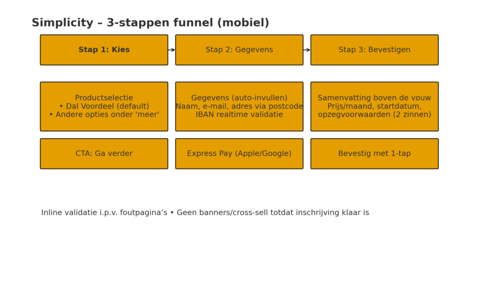 3. Ik ontwerp een inschrijfflow met maximaal drie stappen: kiezen, gegevens, bevestigen. Ingelogde gegevens worden automatisch ingevuld en adres wordt opgehaald via postcode-lookup. IBAN wordt realtime gevalideerd en Apple Pay of Google Pay staat klaar voor een 1-tap betaling. De belangrijkste samenvatting staat boven de vouw met prijs per maand, ingangsdatum en opzegvoorwaarden in twee korte zinnen. Fouten worden inline getoond zodat je zonder pagina-reload kunt corrigeren. Afleidende banners en cross-sell verschijnen pas na succesvolle inschrijving, niet tussendoor.